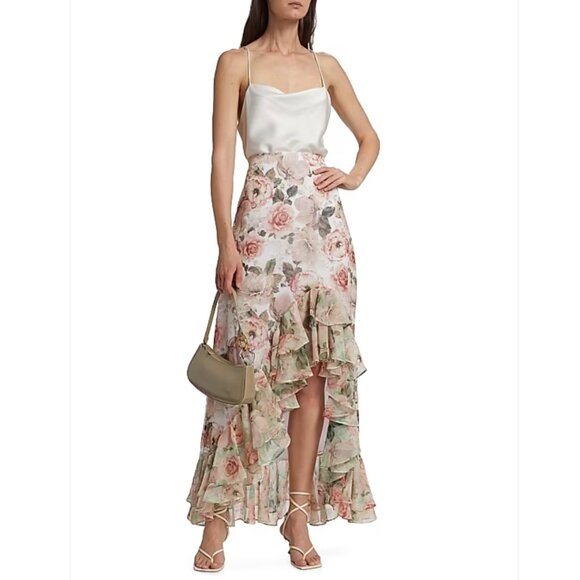 Alice + Olivia Braylee Asymmetric Floral Rose Ruffle Slip Midi Skirt Size 4