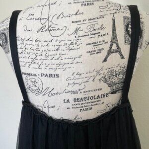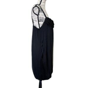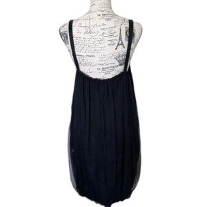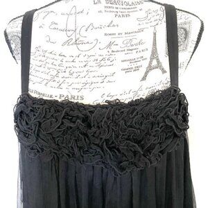 Silk dress with straps, bubble hem and ruffled chiffon like rosette style accent. Dress has chiffon like layer over satin like black silk. Has soft pleating, lined pockets and is very roomy! Gently worn and in very good condition.