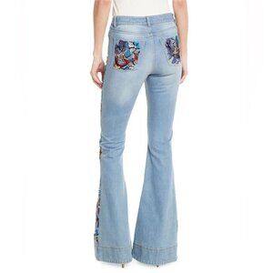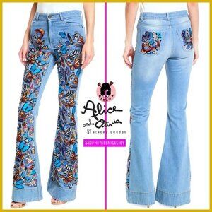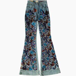 Keywords: butterfly embroidered jeans, bell bottom jeans, Alice + Olivia denim, vintage wash flare jeans, high rise stretch jean, hippie chic jeans, boho flare denim, vibrant embroidered jeans, festival denim, retro silhouette jean, designer flare jean, limited edition embroidered denim, statement jeans, colorful butterfly details, luxury casual wear