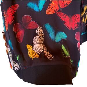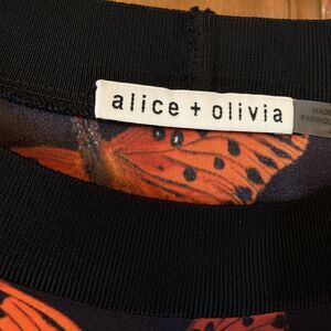 Retail $350. The most beautiful, lightweight and silky smooth blouse/top from Alice + Olivia. In excellent, preowned condition with no flaws detected! A size large. Excellent mixed print design with butterflies and leopard print down the sleeves. Please note that there is a stretch waistband and cuffs. Pullover styling.
