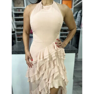 An elegant maxi dress from Alice + Olivia. Features a tiered, ruffled skirt, adjustable halter tie neck closure, and an exposed back zipper. Lined to approximately knee length.