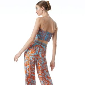 Stylish top with an intricate orange and blue pattern. Perfect for any outings.