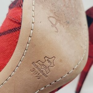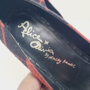 Stylish plaid heels with a pointed toe. Perfect for a bold fashion statement. Red and heels by Alice & Olivia, size 9. Excellent pre-owned condition overall; slight wear on bottom soles.