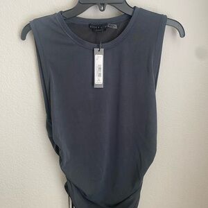 This stylish gray tank top from Alice + Olivia features a fitted, sleeveless design with a chic cropped length. The ruched detailing along the sides adds a touch of elegance and adjustability, making it a versatile addition to any wardrobe.
