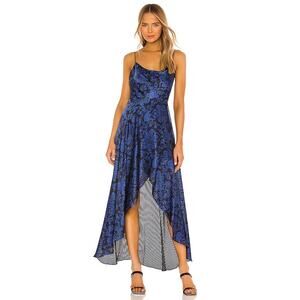 GORGEOUS Alice + Olivia Christina Hi-Lo Dress! Elegant cowl neckline, spaghetti straps, dramatic high-low hem. Flowy satin fabric drapes beautifully with every step. Stunning deep blue/navy print adds regal, romantic vibes. Zip back closure. Wrap front with half lining. So flattering and elegant