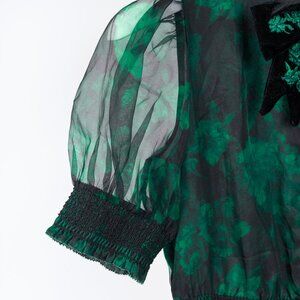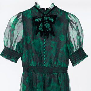 This Coletta dress from Alice + Olivia is crafted with a silk organza in a Dream Floral Emerald pattern, and features short puffed sleeves with shirred cuffs, a ruffled mock neck, a removable embroidered velvet bow, front button closures, a shirred waist, a tiered A-line skirt, a maxi-length hem, an exposed back zip closure, and is lined in a tonal satin.
