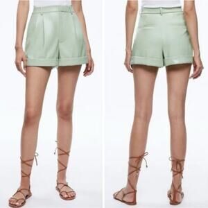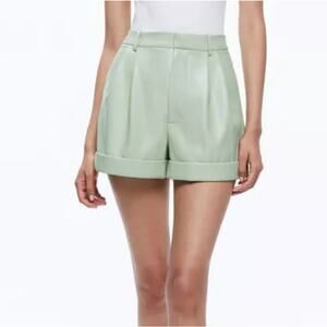Alice + Olivia Conry Leather Pleated Shorts Sage Green Cuffed Size US 12 NEW