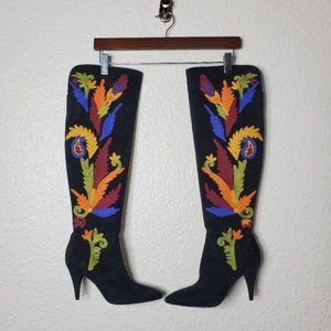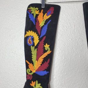 Details: Black Suede leather goat skin black tall boots with Vibrant colorful embroidery. pointed toe sculpted covered heel leather sole.