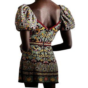 It has pretty puffed sleeves and nips in at the waist before falling to the particularly short mini hem.