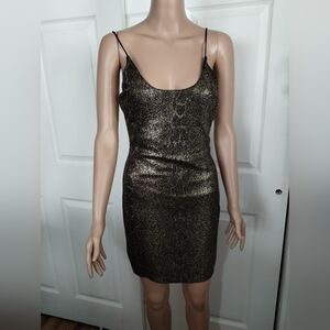 Elegant black dress with shimmering gold accents. Perfect for evening wear.