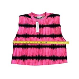 This Alice + Olivia Desma Cropped Tie-dye Muscle Tank in size Medium is perfect for any party or cocktail event. The tank features a round neck and sleeveless design, with a fun and stylish tie-dye pattern in pink. It also comes with shoulder pads and is made from high-quality materials, ensuring both comfort and durability.