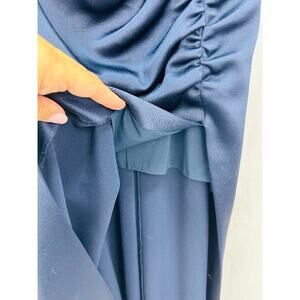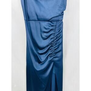 This chic Alice + Olivia Dion slip dress is the perfect mix of timeless elegance and modern edge. Designed in a luxe navy satin-like fabric with a sultry side slit, it drapes beautifully for a flattering silhouette. Whether worn to a cocktail party, wedding, or formal dinner, this piece is made to turn heads.