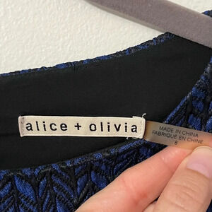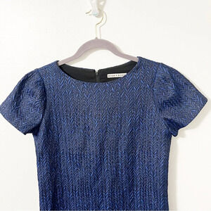 DETAILS: Alice & Olivia dress women's 6, Liv style, blue and black herringbone stitched mini dress with a drop waist and delicate puff sleeves, back zip closure, polyester blend (very light stretch), lined, dry clean. STYLE: cocktail party night out special occasion holiday seasonal wedding guest glam MEASUREMENTS: 18" pit to pit | 34" waist | 33" length CONDITION: excellent preowned