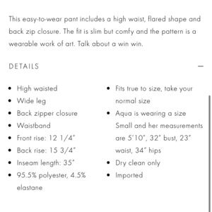 This easy-to-wear pant includes a high waist, flared shape and back zip closure. The fit is slim but comfy and the pattern is a wearable work of art. Talk about a win win.