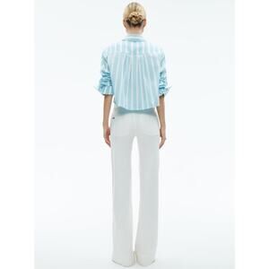 Elevate your wardrobe with this Alice + Olivia Finely Cropped Button Down Shirt in the coveted Dream Stripe Spring Sky print. Crafted from a luxurious cotton-silk blend with added stretch, this high-fashion blouse features a modern cropped length, extra-oversized fit, exaggerated cuffs, and a crisp collared neckline. A perfect transitional piece, it can be worn casually with denim or dressed up with skirts, trousers, or layered over swimwear for resort-ready style.