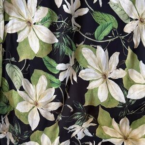 Stylish floral button-up blouse with long sleeves. Features a vibrant green and white floral pattern on a black background.