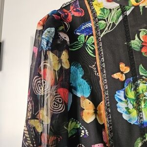 Like new Alice + Olivia floral/butterfly top. Sheer sleeves, gathered waist and wrists, zip closure in back, crop length. Brand runs small, so I sized up to a M but normally wear a S. No rips/tears, and zipper fully functional.