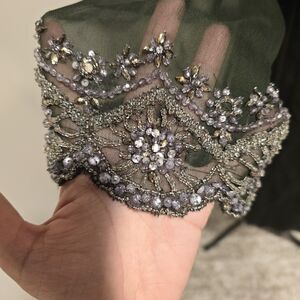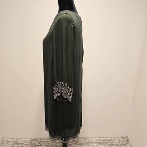 Alice + Olivia Frieda Embellished Shift Dress. 100% Silk. Sheer Sleeve. Gorgeous beading details. Olive green color.