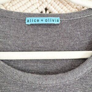 Alice + Olivia gray belted sweater dress in excellent used condition. Size and material tag are missing, but based on measurements, it best fits a Medium to Large. Soft knit construction with a flattering silhouette—perfect for layering in fall or wearing on its own in winter. A chic and versatile closet staple from a luxury contemporary brand known for quality and timeless design. Measurements in photos.