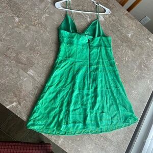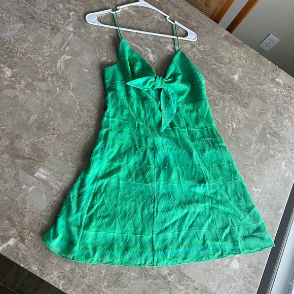 Chic Alice + Olivia dress in vibrant green. Features a bow detail and geometric patterns. Perfect for any occasion.