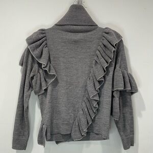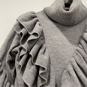 Knit in a luxe wool blend, this turtleneck sweater is adorned with fluttering ruffles around the sleeves and across the body.