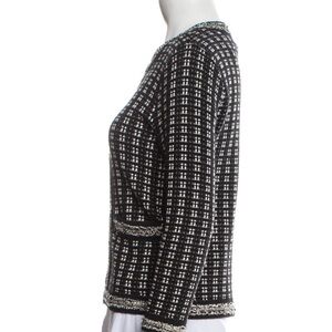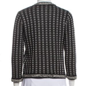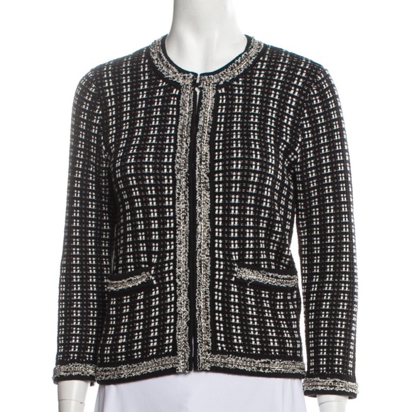Elevate your style with this chic black and white tweed jacket. This jacket offers a timeless look with its classic design.