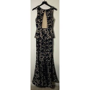 Jae velvet peplum open back gown from Alice + Olivia. Black over beige. Bateau neckline. Sleeveless. Trumpet silhouette. Peplum waist. Open back. Hidden zip. Size 4. Approximate flat lay measurements- Bust: 17” across from armpit to armpit. Waist: 13.5” across. Length: 62”. Some loose threading at back hem but otherwise in good preowned condition with no tears or stains.