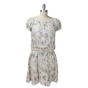 Alice + Olivia Janelle off the shoulder silk mini dress in ivory with black embroidered accents. Size 10. In gently preowned condition, no flaws noted.