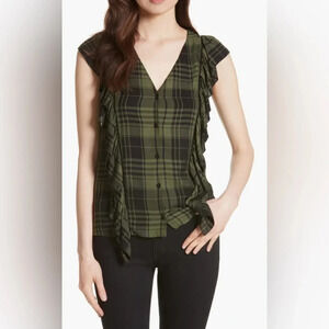 Alice + Olivia Janet Ruffled Plaid Top Green Black Blouse Womens Size XS