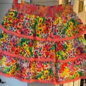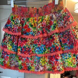 Alice & Olivia Jia Garden Floral Ruffle Smocked Mini Skirt, Size 0. This adorable mini is multi-colored hot pink, yellow, green, blue with tiered ruffles and smocked zipper waist. Looks amazing with all colors and perfect for spring/summer upcoming season. WORN ONCE, so practically NWOT. Look close at clear tag to the right of manuf tag to see size "0". Smoke free home, quick ship time. I accept most REASONABLE offers, so please make offer.