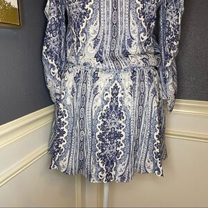 A perfect summer dress with on-trend boho china blue paisley pattern, the Alice and Olivia Jolene mini dress . Double layered, the dress features breezy cold shoulders, a v-neckline, smocked waist and cold shoulder sleeves 100% viscose V-neckline Paisley print Cold shoulders Smocked waist Double layered