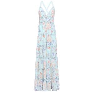 Crafted from ultra-light chiffon, this dress floats like a dream with every step. The delicate floral print in pastel mint, lavender, and coral feels like spring in Positano, while the lace-trimmed tiers and plunging V-neckline add a whisper of vintage romance. Crisscross straps in the back complete the ethereal vibe — perfect for weddings, summer soirées, vacations, or just romanticizing your everyday errands.