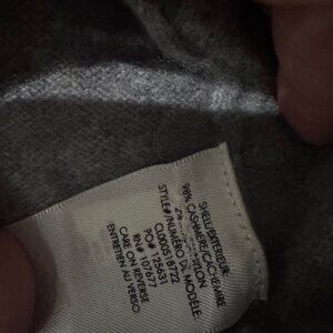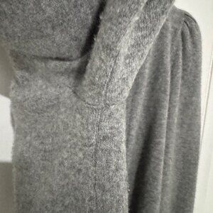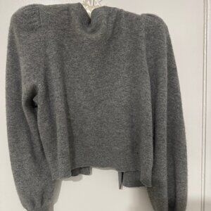 98% cashmere, 2% nylon. Front tie closure at neckline. Blouson sleeves with tulle stitched in the shoulders for structure and puff. Soft cashmere fabric with banded hem. No pilling at arms or on the fabric. Perfect open or tied in a bow. Cardigan hits at the top of the waist.