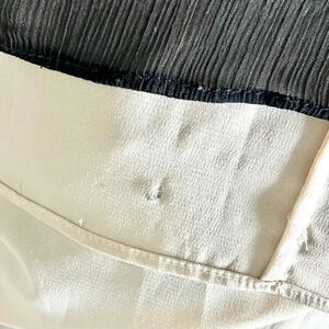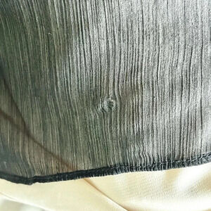 Has a small dark near the bottom back hem of the lining and a small run in the of the sheer shell in the same spot that is not very noticeable