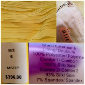My Favorite Dress in my closet!! Hate to part with it but I purchased for a summer wedding and didn't get to wear itโ๏ธ๐๐ the pictures don't do this Beauty justice!! Mostly 100%Silk layers and layers of chiffon in the most beautiful Lemon color. Fully lined, even the sleeves, satiny lining. Exposed Gold zipper. Adorable capped off the shoulder sleeves. True size 6, 32 inches neck to hem, 32 inches across Bust, 28 inches at narrowest waist and 34 inches at widest Hip. Sheath style, curvy fit