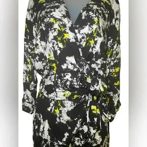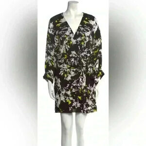 Keywords: Alice and Olivia wrap dress, abstract print mini dress, long sleeve dress, date night dress, black white neon dress, viscose mini dress, size 10 women’s designer dress