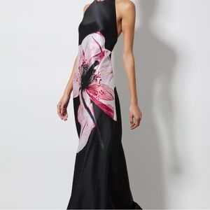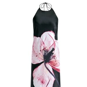 Chic black maxi dress with bold pink floral print. Perfect for elegant occasions.