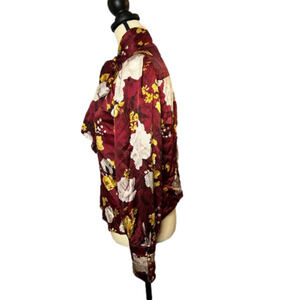 Chic maroon blouse with vibrant floral design. Features an elegant neck tie. Ideal for versatile styling.