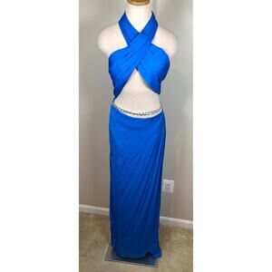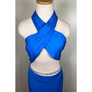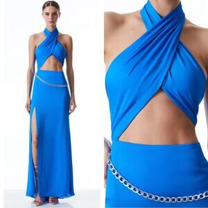 Alice + Olivia May Halter Neck Chain Waist Cutout Palace Blue Maxi Dress Sz 10