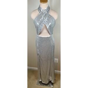 Alice + Olivia May Halterneck Silver Sequin Cutout Maxi Dress Size 8 is brand new with tags!