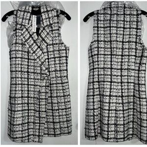 We took a very classic menswear piece-a double breasted tweed blazer-and made it perfect for you. It includes an asymmetrical wrap shape, mini length, sleeveless silhouette and metallic threads woven straight into the tweed. It's an instant outfit indeed.