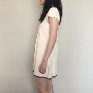 This cute, one of a kind Alice Olivia dress from 2005-2006 collection is the perfect dress for going to a nice dinner and garden party. Only worn once for a ceremony, it's in a good condition. Due to moving from packing to unpacking, it is a bit wrinkly as shown in the picture. The rim around the neck is lined with jewelry both front and back, fray edges around the skirt. The color of the skirt is off white with grayish brown. 93% silk, 7% spandex.
