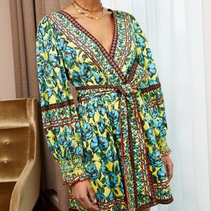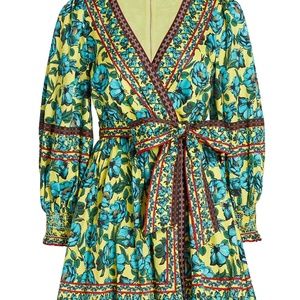 Designed with striped trim, this mini dress features a vibrant scarf-like print and a flattering wrap silhouette.