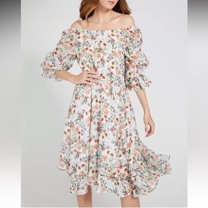 This midi sundress features a multicolored floral print with an on or off-the-shoulder neckline and ruffled details, perfect for wedding guest or resort wear. In very good condition with only one small hole in lining and a small sheer spot, as shown in last two photos. This is in the bottom lining and does not show while wearing the dress.