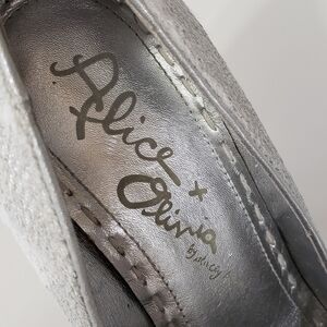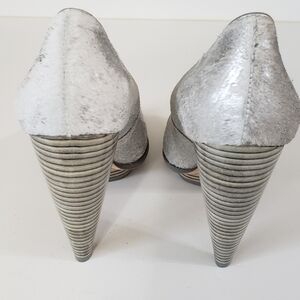 Alice + Olivia Miranda silver pumps made of haircalf and leather. Stacked wooden heel.