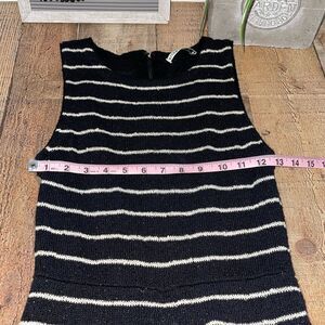 A tactile striped sweater dress flecked with silvery sparkle flares from the natural waist into a gentle a line skirt.