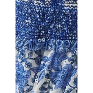 Self: 100% polyester Lining: 94% polyester 6% elastane. Made in China. Dry clean only. Partially lined. Exposed back zipper closure. Self-tie shoulder straps with tassel ends. Smocked bodice Eyelet embroidery throughout and tassel ends at hem.