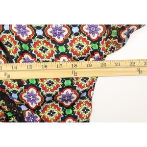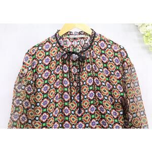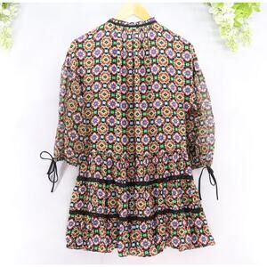 Vibrant floral mini dress. Features multicolor pattern. Puff sleeves with tie details. Perfect for a chic look.