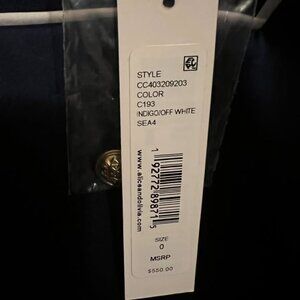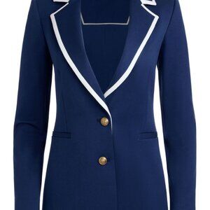 indigo blue/off-white; contrasting trim; notched lapels; front button fastening; long sleeves; buttoned cuffs; two front welt pockets; straight hem; Polyester 64%, Viscose 33%, Elastane 3%. Never worn. Tags still attached.