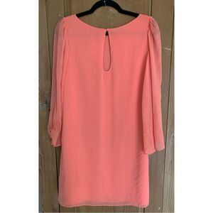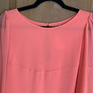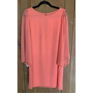 Alice + Olivia flutter sleeve chiffon dress with sheer overlay and loose flowy silhouette. Back button closure with keyhole opening. Papaya (peach) color and boat neckline. NWT